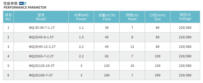 WQ(D)清污兩用(yong)大流量潛(qián)水泵本電(diàn)泵由水泵(beng)、密封、電動(dòng)機三部分(fèn)組成。電泵(beng)内配有保(bǎo)護裝置,電(dian)動機位于(yú)電泵上部(bu),爲單相或(huò)三相異步(bù)電動機。