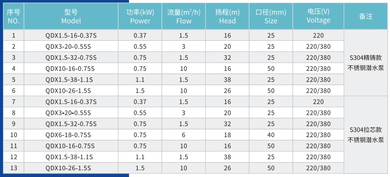 QDX國(guó)标全不鏽(xiù)鋼簡潛水(shui)泵适用于(yú)工礦企業(yè)、食品行業(ye)、海水養殖(zhi)、景觀工程(cheng)、深井🐪提水(shui)⭐、農田灌溉(gài)等一般腐(fǔ)蝕性介質(zhi)。